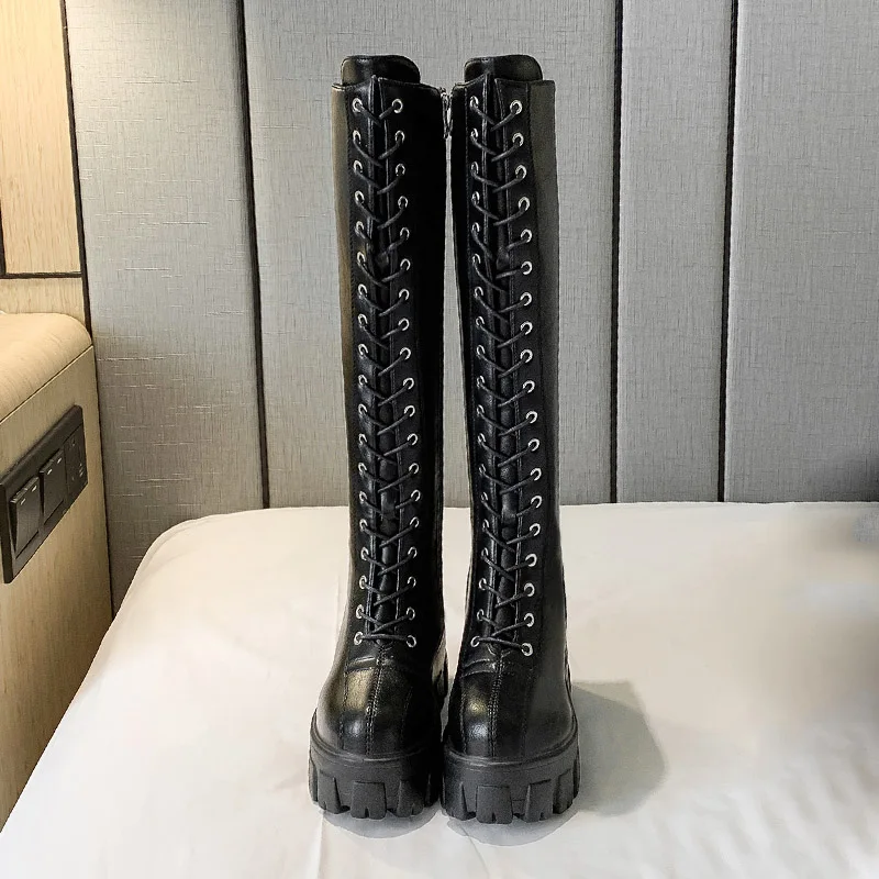 Product Name: Botas altas hasta la rodilla de cuero pu con plataforma gruesa Rimocy para Mujer botas largas de Mujer con cordones de altura Punk Retro 2020