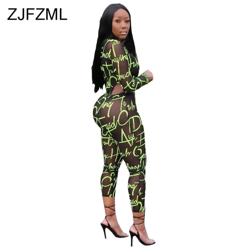 Special Offer Conjunto de dos piezas de malla con estampado de letras de neón para mujer de manga larga ver a través de Bodysuit y pantalones flacos conjunto de 2 piezas Discount 36% Today!